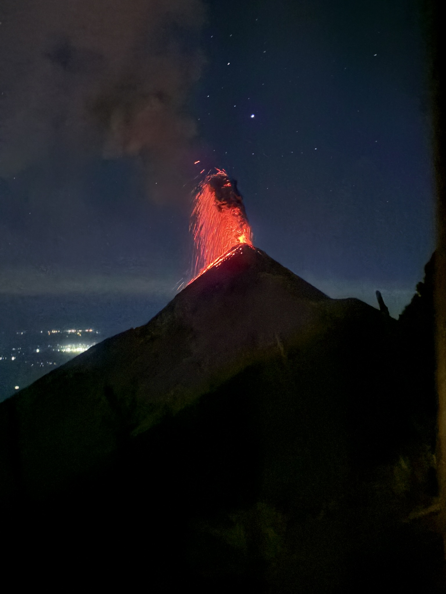 It was dark now, so we had our head lamps on and made the steep descend back down Fuego. There were lots of people coming up the mountain at this time as the sunset crews went down. Everyone was falling down on the descend because of the volcanic rock. It was definitely challenging on the knees as well and our vision was still not fully clear due to the volcanic ash in the air.
